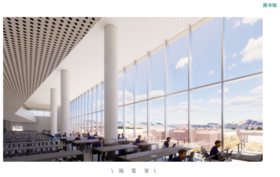 設(shè)計理念源自中國文人素有游歷山川,在自然中探求境界提升的傳統(tǒng),設(shè)計以“學(xué)者之山”為主題,以甘肅的特色地貌為靈感,呈現(xiàn)富有雕塑感的山石般的體量。建筑中部設(shè)置360°全景閱讀層,純凈通透,意喻通過學(xué)習(xí)開璞見玉,挖掘潛力、提升價值。