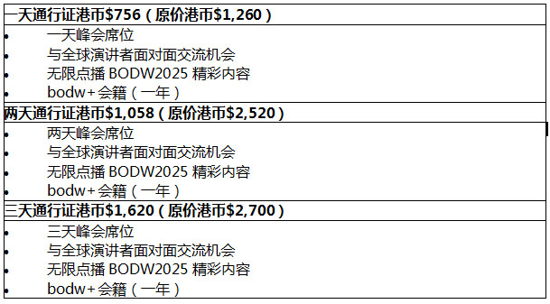 設(shè)計(jì)營商周2025套票現(xiàn)已接受訂購,把握機(jī)會在推廣期內(nèi)訂票,可享有以下限時優(yōu)惠: