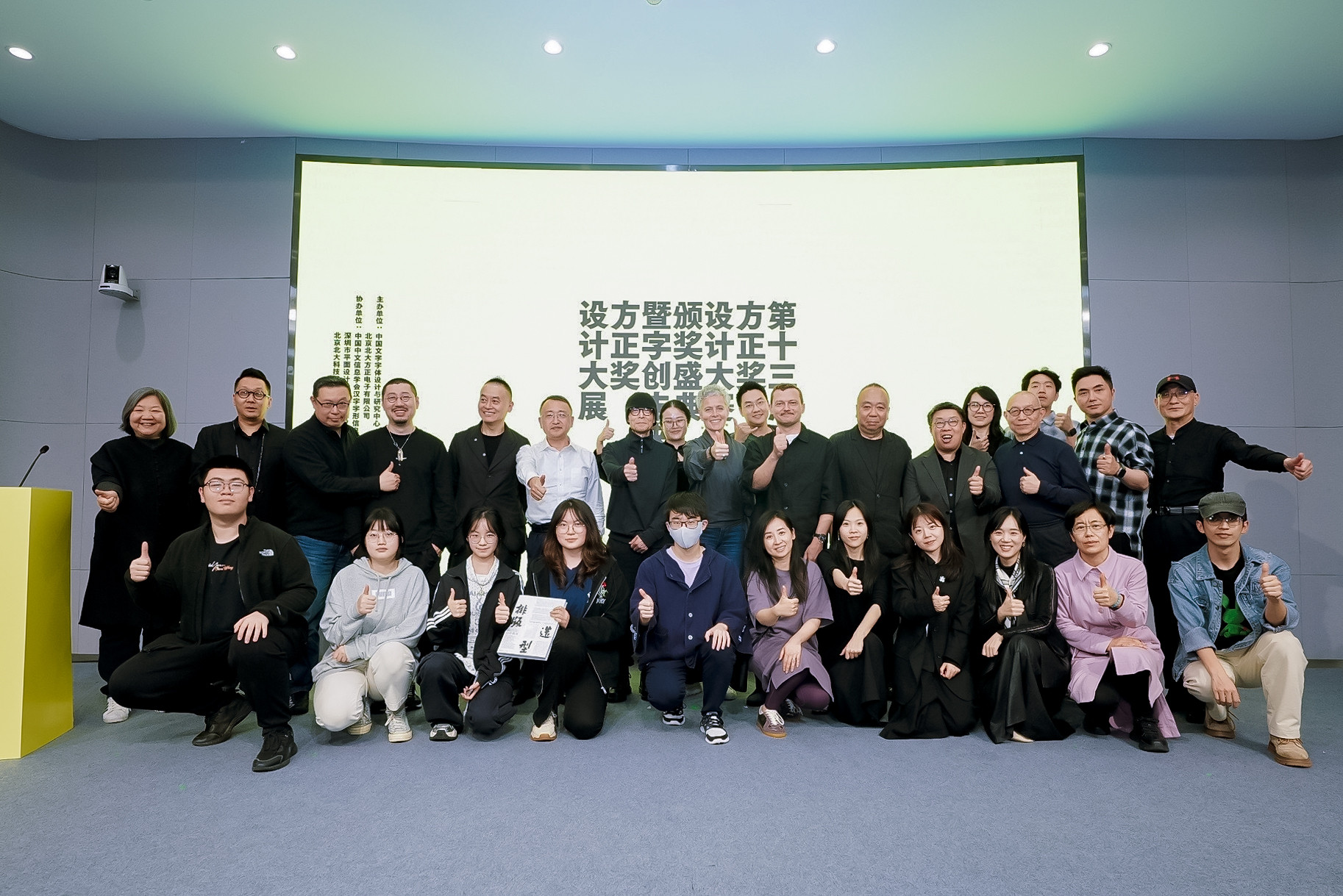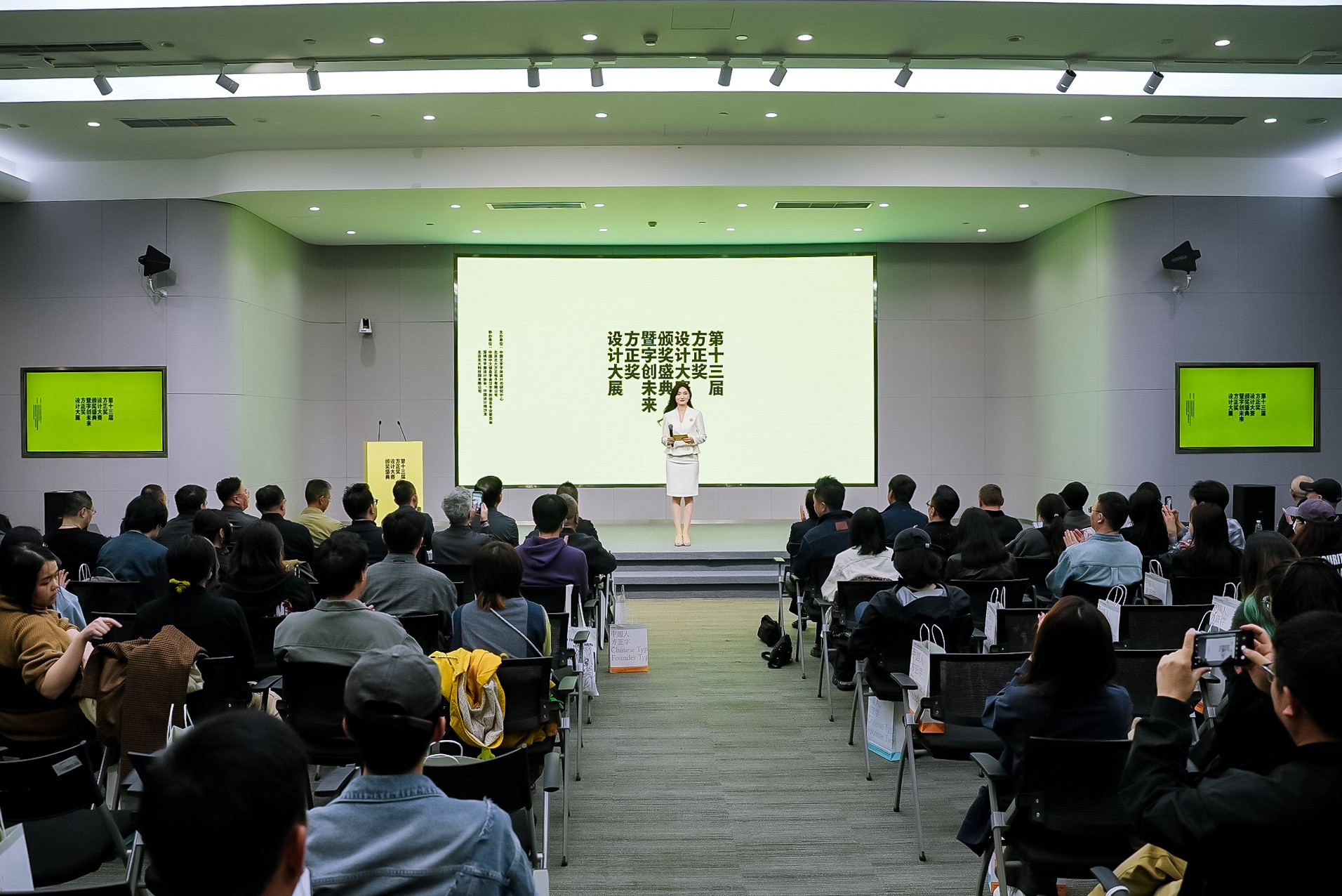 大會(huì)頒獎(jiǎng)環(huán)節(jié),教育部語言文字信息管理司二級(jí)巡視員王丹卉、中文組評(píng)審主席王敏、拉丁文組評(píng)審主席Jean-Baptiste Leveé、拉丁文組評(píng)審Veronika Burian、字體應(yīng)用類評(píng)審主席何見平、中國(guó)設(shè)計(jì)師沙龍主席劉天亮、字體中心主任郭宗明、方正電子CEO鄭偉,為獲獎(jiǎng)?wù)叽眍C發(fā)了獲獎(jiǎng)證書。