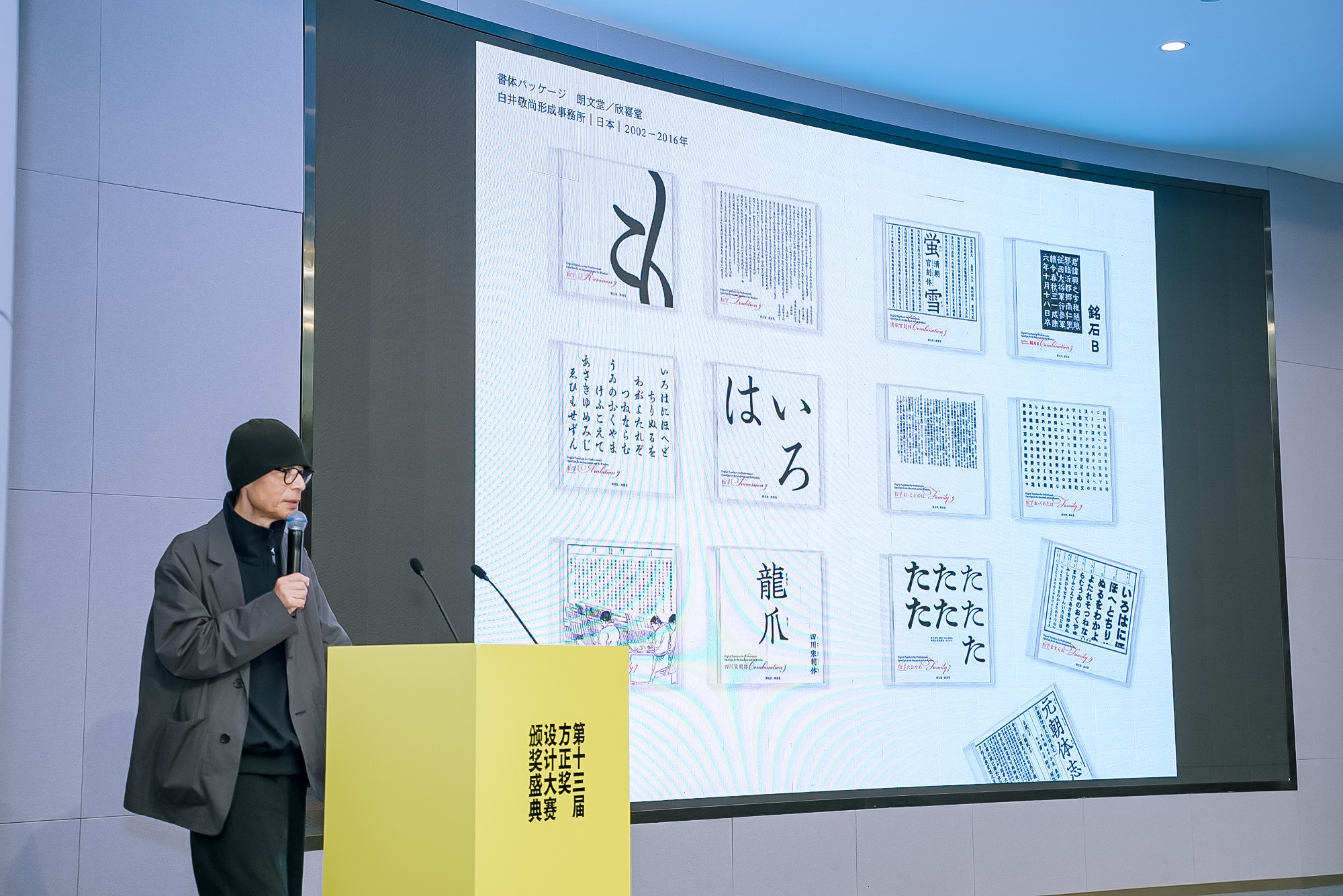 在漢字文化圈各國(guó)日益密切的交流趨勢(shì)下,本屆大賽邀請(qǐng)到武藏野美術(shù)大學(xué)教授白井敬尚擔(dān)任中文組評(píng)委。會(huì)上,白井敬尚以「type & typography(字體與排版造型)」為題發(fā)表演講,他首先梳理了字體排印的發(fā)展歷史,介紹了日語的文字構(gòu)成,隨后結(jié)合自己數(shù)十年來在字體與排版領(lǐng)域的長(zhǎng)期實(shí)踐與研究成果,生動(dòng)展示了日本字體設(shè)計(jì)在精度與品質(zhì)上的標(biāo)桿水準(zhǔn)。