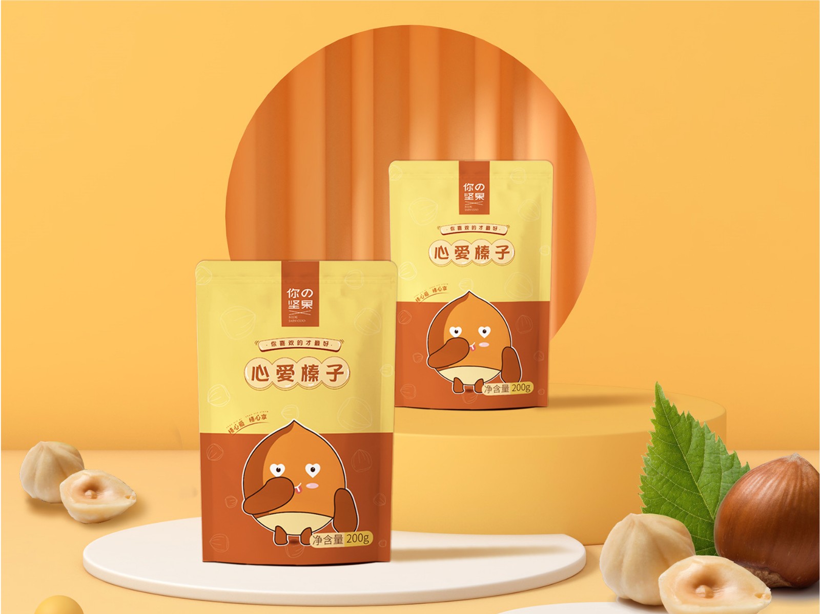 系列包裝設(shè)計(jì)主要圍繞一種可愛(ài)、趣味的氛圍感進(jìn)行的產(chǎn)品包裝設(shè)計(jì),以堅(jiān)果的原型受啟發(fā)設(shè)計(jì)卡通形象作為為主畫(huà)面,再配一趣味性的文案與之相結(jié)合,形成一幅趣味性的畫(huà)面,并配以符合堅(jiān)果本身調(diào)性的顏色來(lái)襯托,顏色以鮮亮的顏色為主,從而吸引消費(fèi)者購(gòu)買(mǎi)興趣。