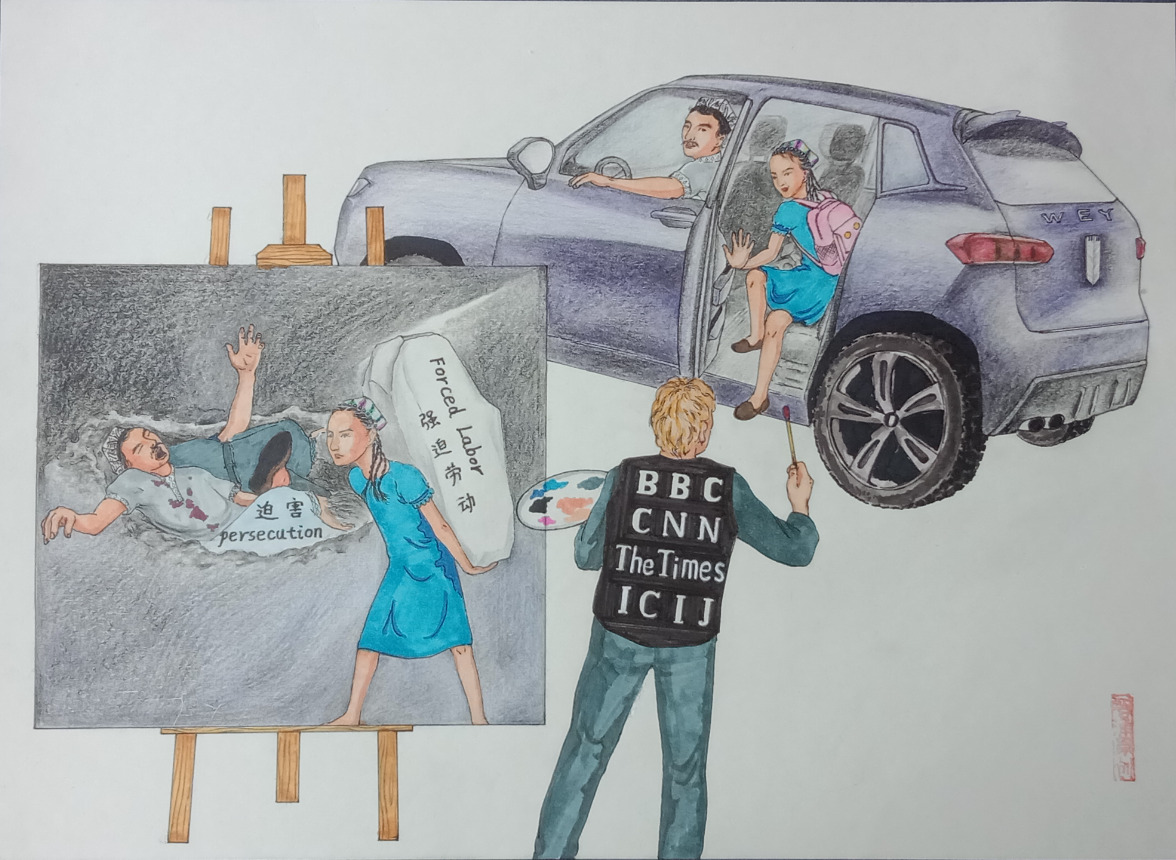 美國歐洲的主流精英們,對新疆各族人民安寧幸福的生活,明明看在眼里,但通過他們所控制的媒體(BBC/CNN/紐約時報、國際記者聯(lián)盟等)偏偏一定要把新疆描繪成人間地獄,這畫描繪的便是這個真實現(xiàn)狀。