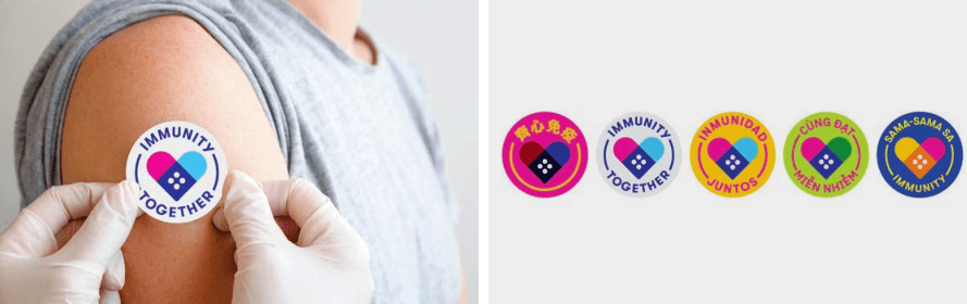 能見度本是平面設(shè)計的基本功能。但在假新聞與謠言充斥的時期里,平面設(shè)計更需要顧及到多元與通用的表現(xiàn)。譬如,美國加州在開始進(jìn)行疫苗接種時,就參考了美國人習(xí)慣于炫耀他們在選舉日時的“我投票了!”貼紙在接種地點也提供了類似的儀式:“一同免疫”(Immunity Together)”貼紙就由此而來。負(fù)責(zé)這項“貼紙”計劃的 fuseproject設(shè)計公司,不僅是這場公共衛(wèi)生運(yùn)動的關(guān)鍵部分,也在信息的傳播方面帶來了親民感——尤其貼紙中的標(biāo)志,以兩個繃帶末端作重疊,進(jìn)而形成一個心形。有了這簡單的設(shè)計,加上明亮與大膽的色彩,還有五種不同語言——英語、西班牙語、漢語、越南語和他加祿語——的口號,該州的多元種族社區(qū)也就能獲得更為準(zhǔn)確的信息。