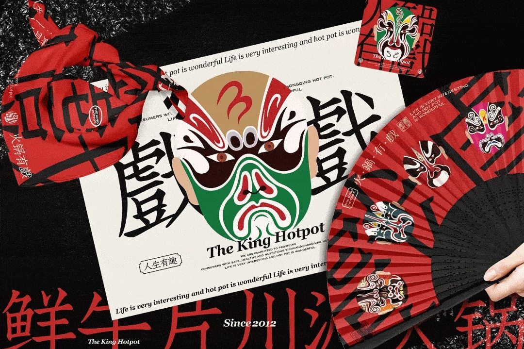“小龘(dá)坎”川派火鍋在品牌logo的設(shè)計(jì)上采用中英結(jié)合的方式,將品牌名稱放大居中,采用獨(dú)特的字體形式,吸引顧客的注意力。在IP形象的設(shè)計(jì)上,川劇作為川派民俗文化的代表,將川劇的變臉作為唯一品牌認(rèn)知,更好地輸出文化地域內(nèi)容。整體色彩的使用上,采用傳統(tǒng)的川劇紅綠配色,貼合臉譜這一視覺核心。