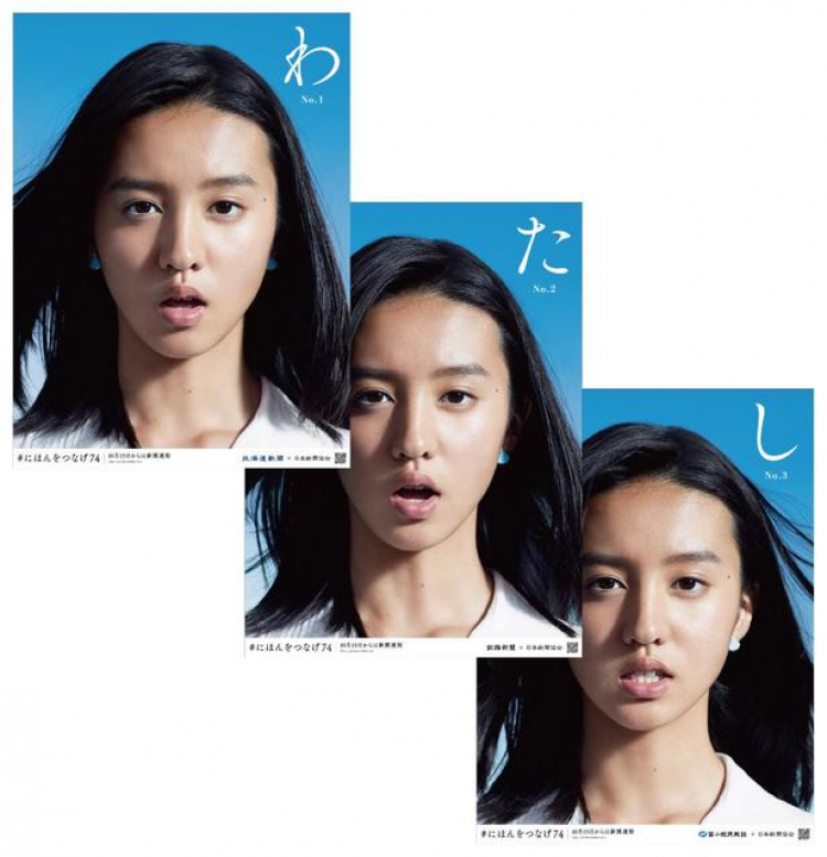 實(shí)際上,這是 2018 年 10 月 15 日,為了慶!皥(bào)紙廣告日”,日本全國(guó)的 74 份報(bào)紙各刊登了一張她的照片。每張照片都有不同編號(hào)和平假名字符,按照編號(hào),將所有報(bào)紙合在一起,才能“解碼”她傳達(dá)的訊息。