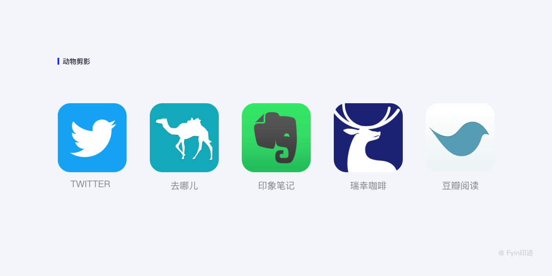 動物作為圖標(biāo)設(shè)計元素是比較常見的方式之一,通過提取動物整體形象或者局部特征部位作為設(shè)計元素,背景填充單色或漸變色,簡潔明了。動物給人的印象比較可愛,有助于加深用戶對產(chǎn)品的印象。常見的表現(xiàn)形式有剪影、線性描邊風(fēng)格、面性風(fēng)格等。