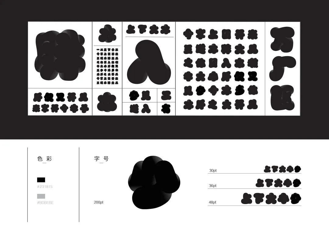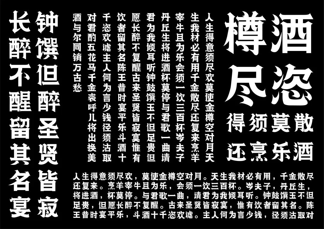 降霜松體取法于金農(nóng)的漆書(shū)《童蒙八章卷》,字體既有古代的渾樸鈍拙,又有現(xiàn)代簡(jiǎn)潔大方的氣息,撇畫(huà)清勁瀟灑,捺畫(huà)厚重沉穩(wěn),氣質(zhì)上使人聯(lián)想起霜雪中傲立的松柏;橫畫(huà)粗重而豎畫(huà)纖細(xì),是一款包含傳統(tǒng)基因和現(xiàn)代設(shè)計(jì)手段的標(biāo)題屬性字體,筆畫(huà)粗細(xì)的強(qiáng)烈對(duì)比使這款字體適應(yīng)海報(bào)、包裝等多種強(qiáng)調(diào)標(biāo)題屬性的應(yīng)用場(chǎng)景。